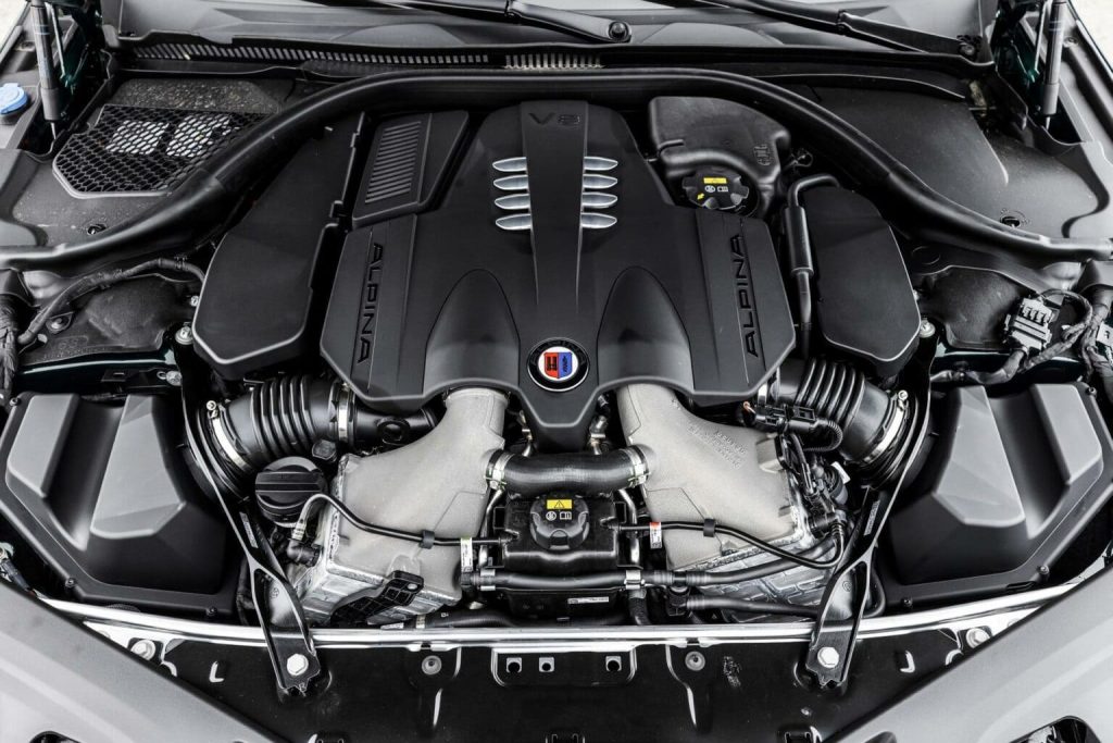 Ẩn dưới nắp ca-pô là một “quái vật” V8 4.4 lít tăng áp kép, có chung kiến trúc với cả N63 trên các mẫu 8 Series tiêu chuẩn và S63 trên M8, nhưng lại đi theo con đường rất riêng. ALPINA tháo rời hoàn toàn khối N63 và tái chế tác theo triết lý của họ: piston mới, cặp turbo twin-scroll cỡ lớn hơn, bộ intercooler nâng cấp, hệ thống nạp và cổ góp xả được tinh chỉnh lại, cùng hệ thống ống xả hoàn toàn mới.