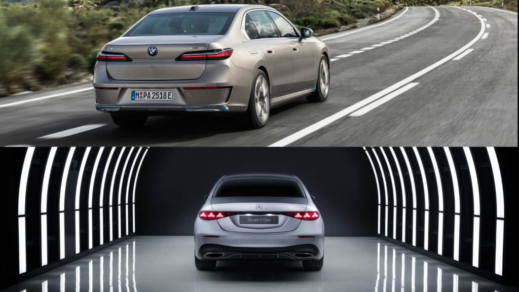 Nhìn từ bên hông, cả hai đều toát lên vẻ bề thế, dù 7 Series có phần “nguyên khối” hơn. Dáng tổng thể của S-Class thực tế không thay đổi nhiều so với năm trước. Tuy nhiên, bộ mâm mới 50 chấu đan chéo cầu kỳ chắc chắn giúp S-Class trông thể thao hơn so với 7 Series — ít nhất là ở góc nhìn ngoại thất. Ngoài ra, BMW 7 Series cũng nhỉnh hơn đôi chút về chiều dài tổng thể so với S-Class.
